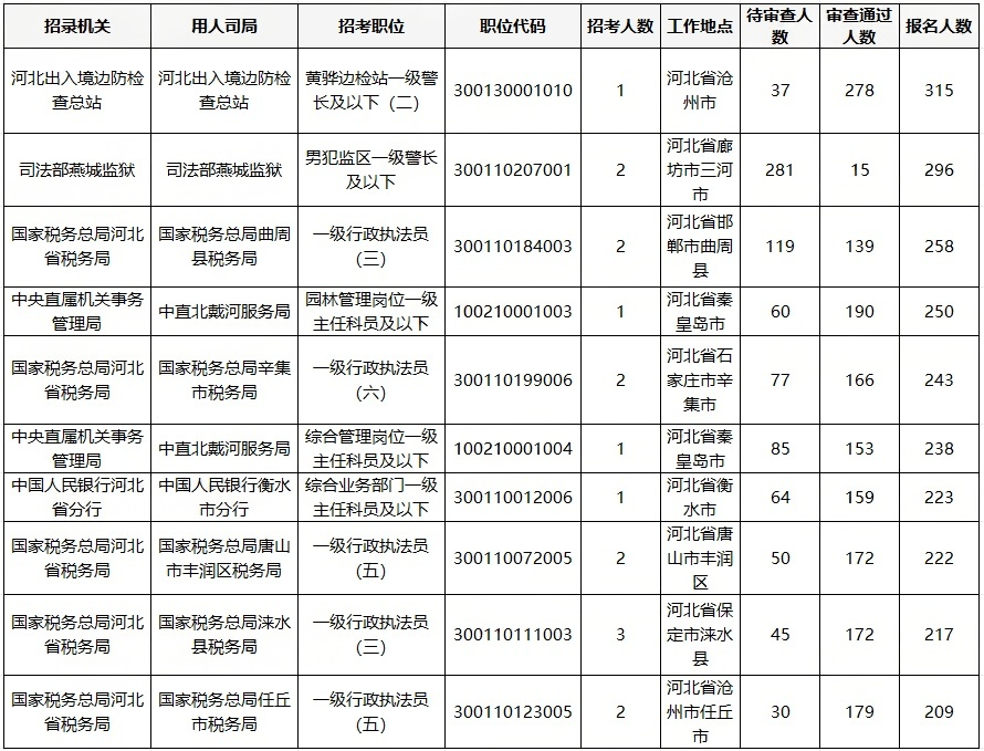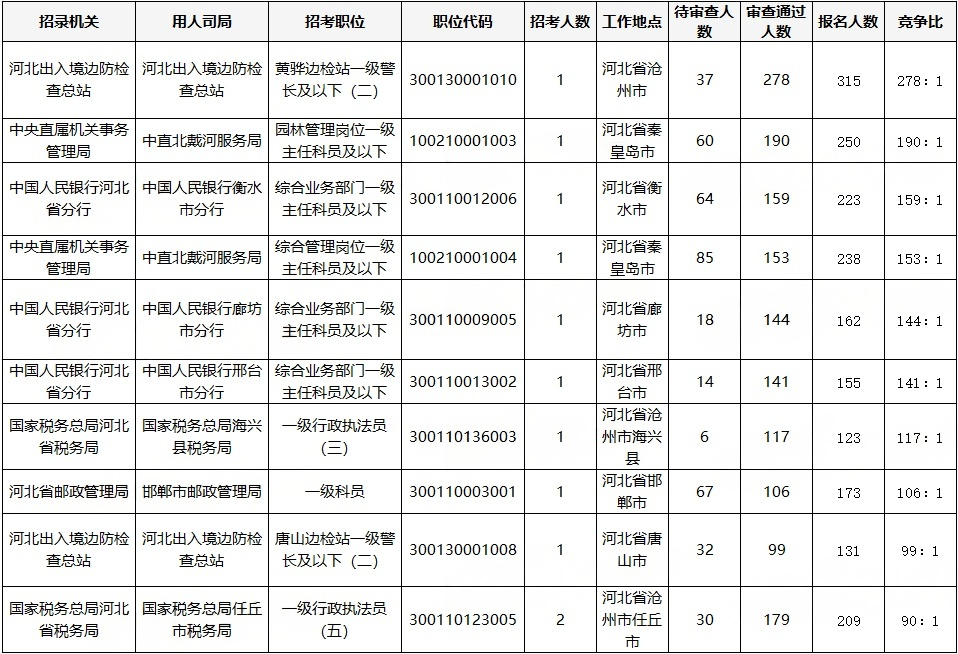 国考河北地区报名前十的岗位