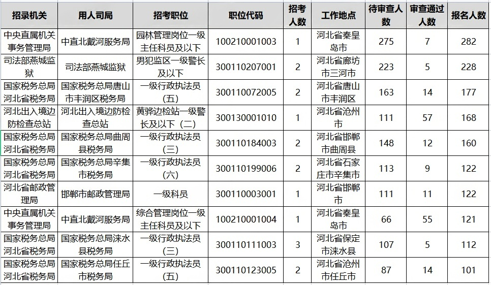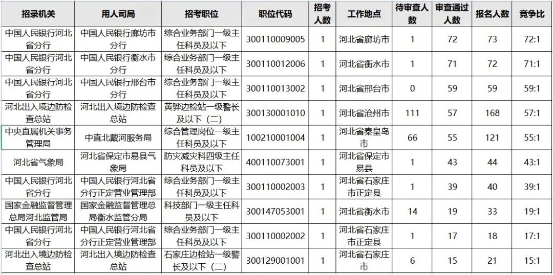 国考河北地区报名前十的岗位