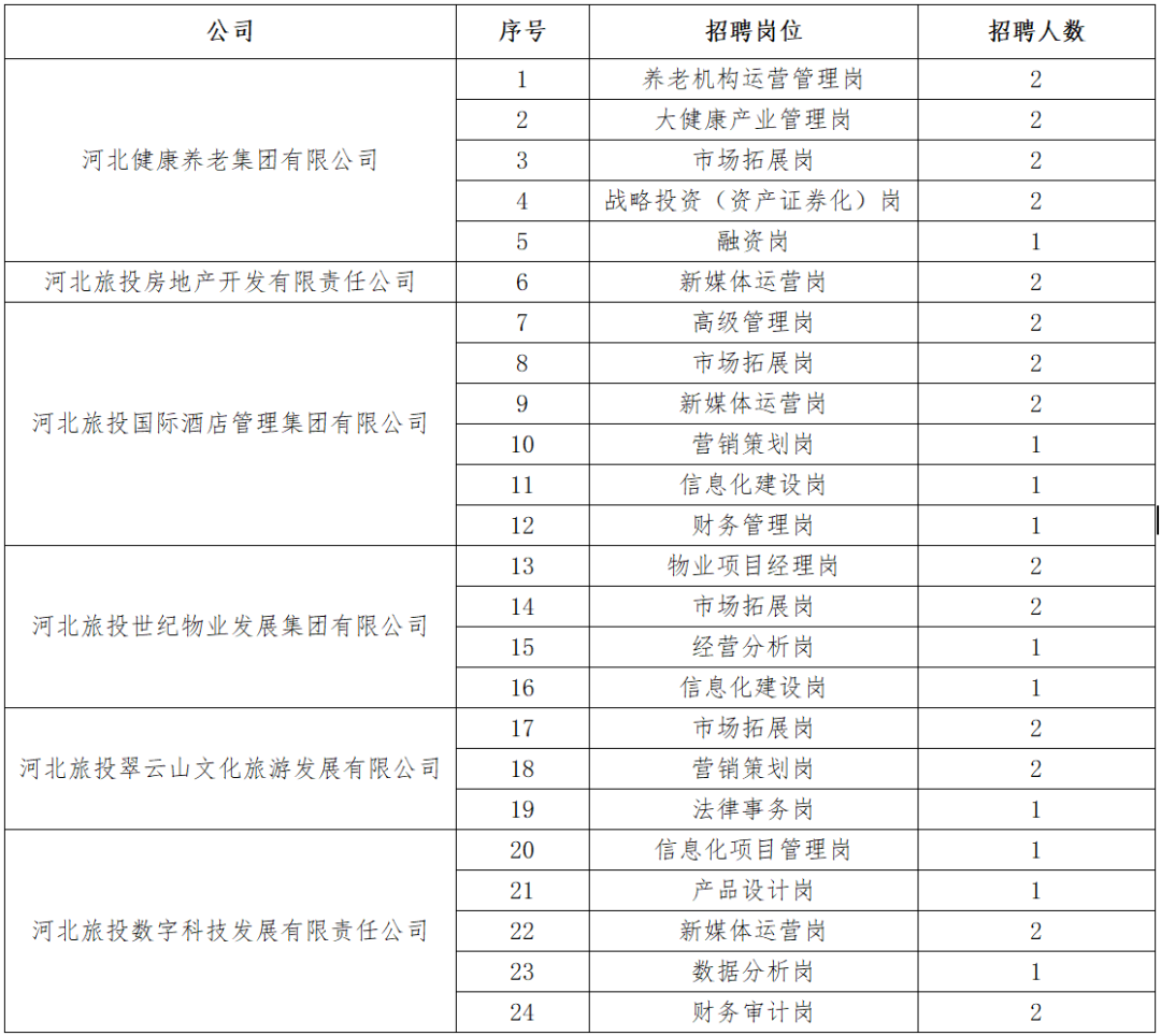河北旅游投资集团股份有限公司根据业务发展和工作需要,现就相关所属单位面向全国公开招聘优秀人才,诚邀社会各界菁英加入。具体招聘公告如下:
